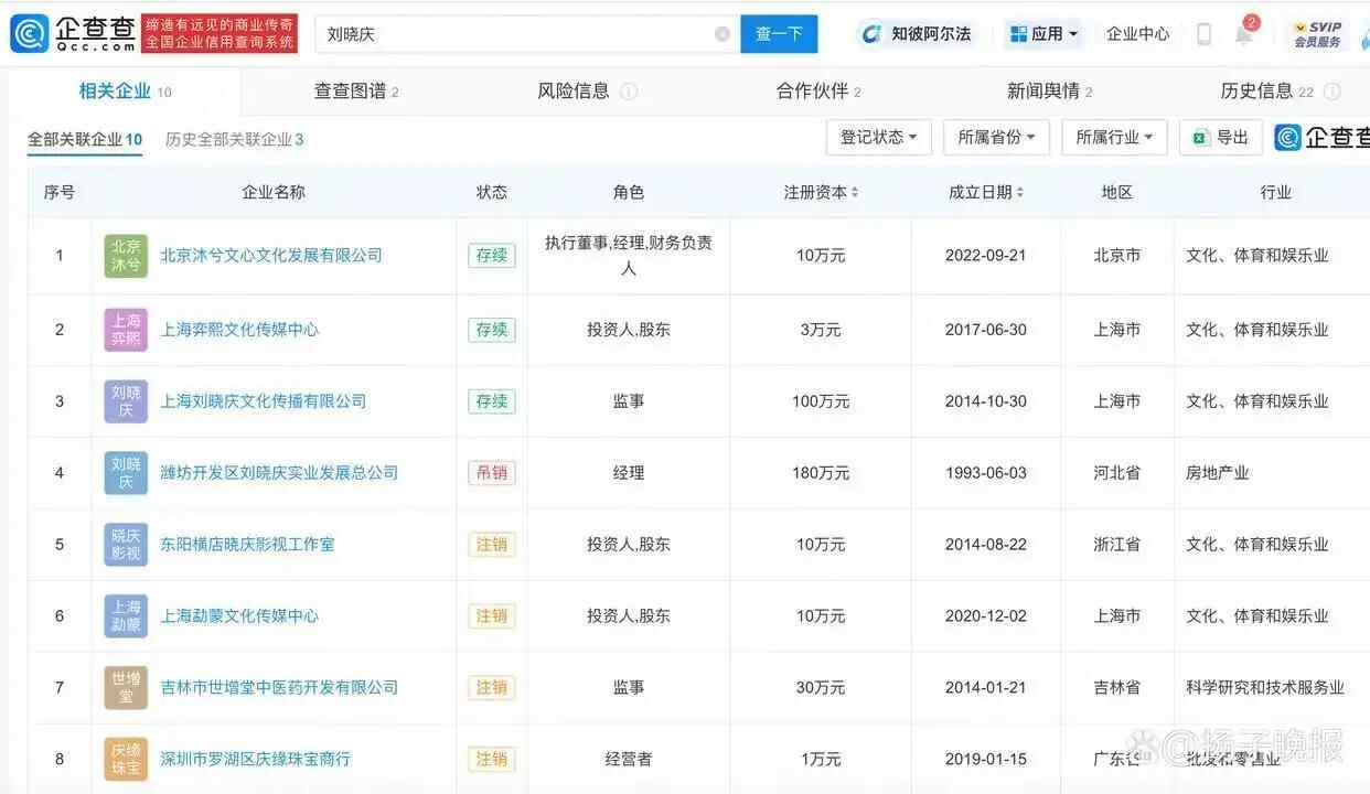 据企查查信息显示,刘晓庆名下关联10家企业,7家为吊注销状态,仅3家公司存续,行业均涉及文化、体育和娱乐业。其担任被指控的上海弈熙文化传媒中心投资人角色,该公司成立于2017年6月,出资额3万元。