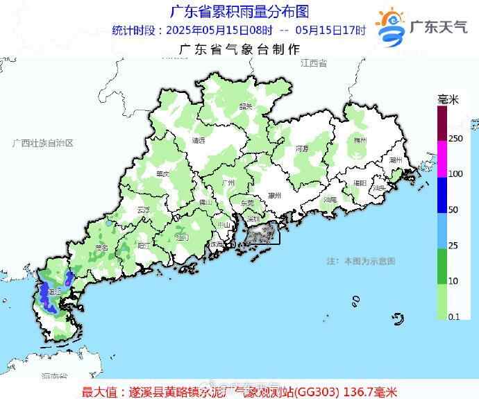 昨天(5月15日)白天,广东的雨水似乎被湛江全包了。15日8时到17时,湛江遂溪县黄略镇累计降水136.7毫米,雷州市杨家镇调乃村气象观测站累计降水110.1毫米,遂溪北坡国家气象观测站累计降水94毫米。