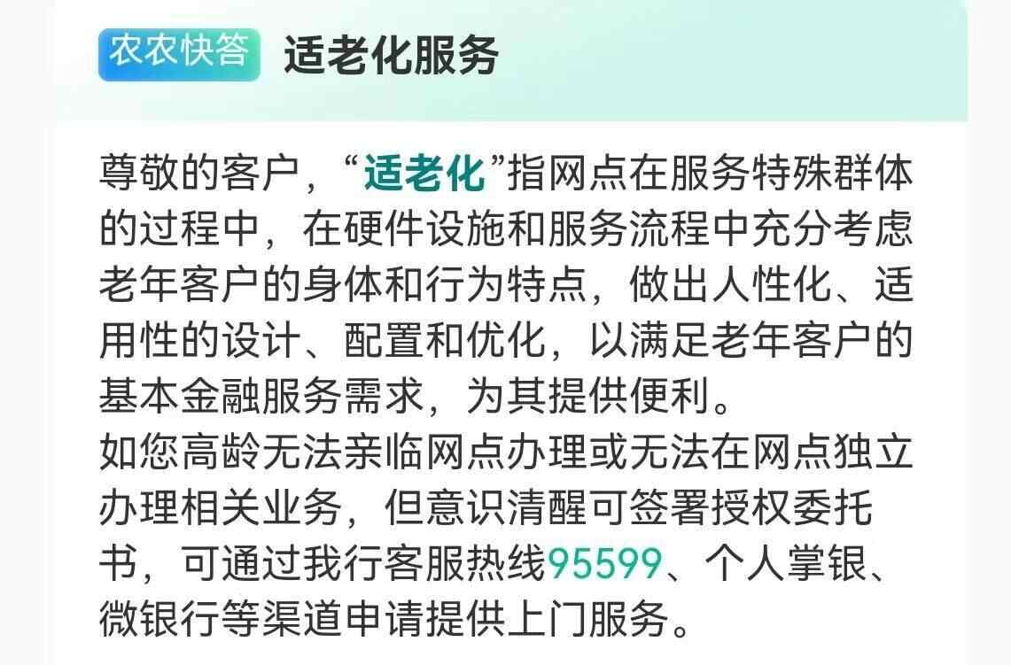 上述APP“适老化服务”词条也提及:“如您高龄无法亲临网点办理或无法在网点独立办理相关业务,但意识清醒可签署授权委托书,可通过我行客服热线95599、个人掌银微银行等渠道申请提供上门服务”。