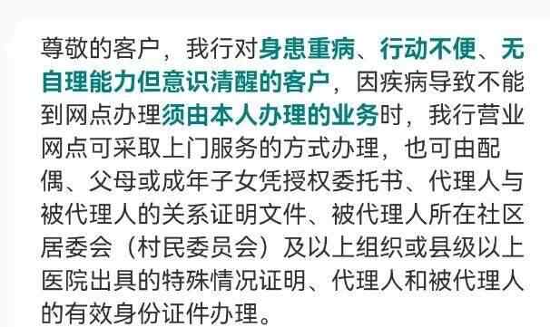 5月15日记者通过中国农业银行APP客服功能查询获悉,“我行对身患重病、行动不便、无自理能力但意识清醒的客户,因疾病导致不能到网点办理须由本人办理的业务时,我行营业网点可采取上门服务的方式办理”。
