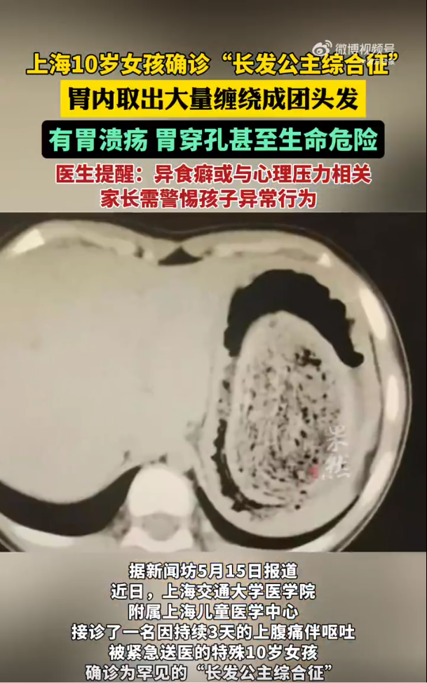 医生表示,“长发公主综合征”是一种罕见的异食癖并发症,多发于青少年,尤其是心理压力大或存在发育障碍的儿童。患者因长期咀嚼或吞咽头发、羊毛等无法消化的异物,导致这些物质在胃内积聚,形成团块。