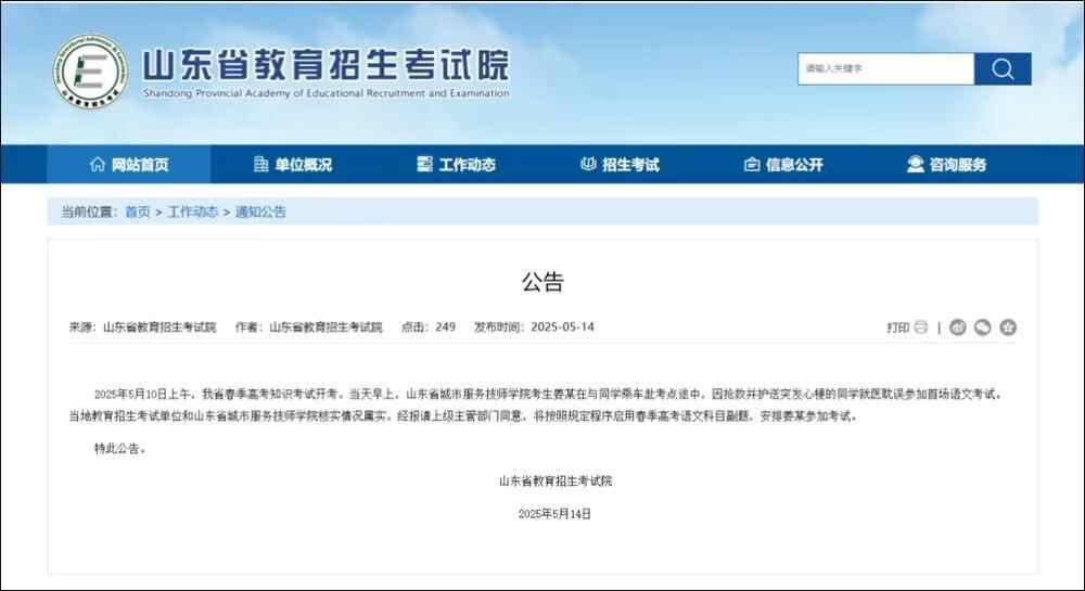 5月14日,山东省教育招生考试院发布公告,经报请上级主管部门同意,将按照规定程序启用春季高考语文科目副题,安排其参加考试。
