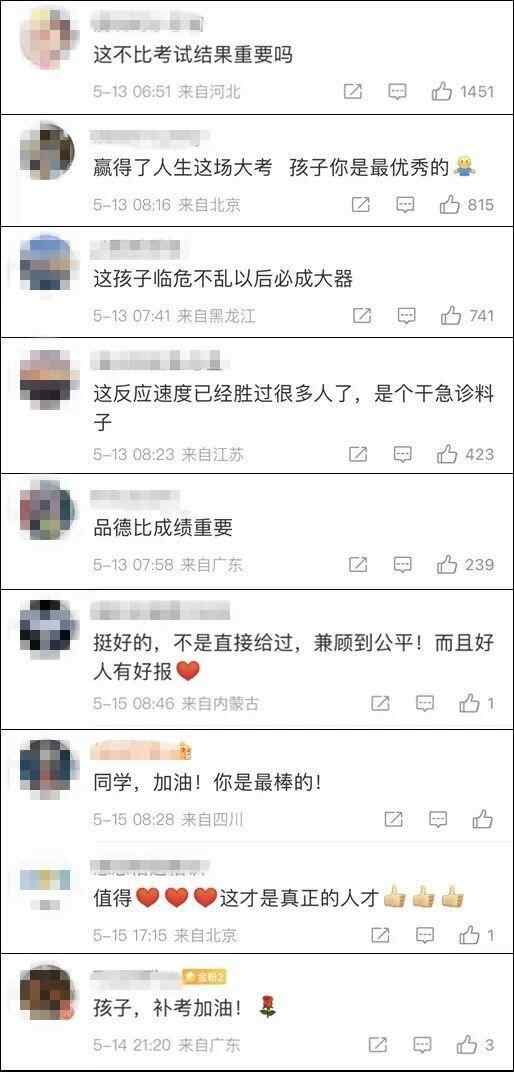 然而姜昭鹏因此错过了语文考试,但他在接受媒体采访时表示并不后悔。“考试一次没考,还有下一次,但同学的生命只有一次,错过了就不会再重来。”姜昭鹏说。