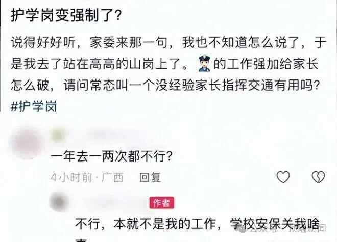对此,右江区教育局工作人员表示:“设立护学岗是有政策文件依据的,因为上下学时交通容易堵塞,文件要求交警、社会机构志愿者还有家长一起组成护学岗,帮忙疏散交通。参加护学岗是自愿的,但有些家长可能一直都不去,所以学校才会这样安排,让每个家长都能够参与到活动中来。”