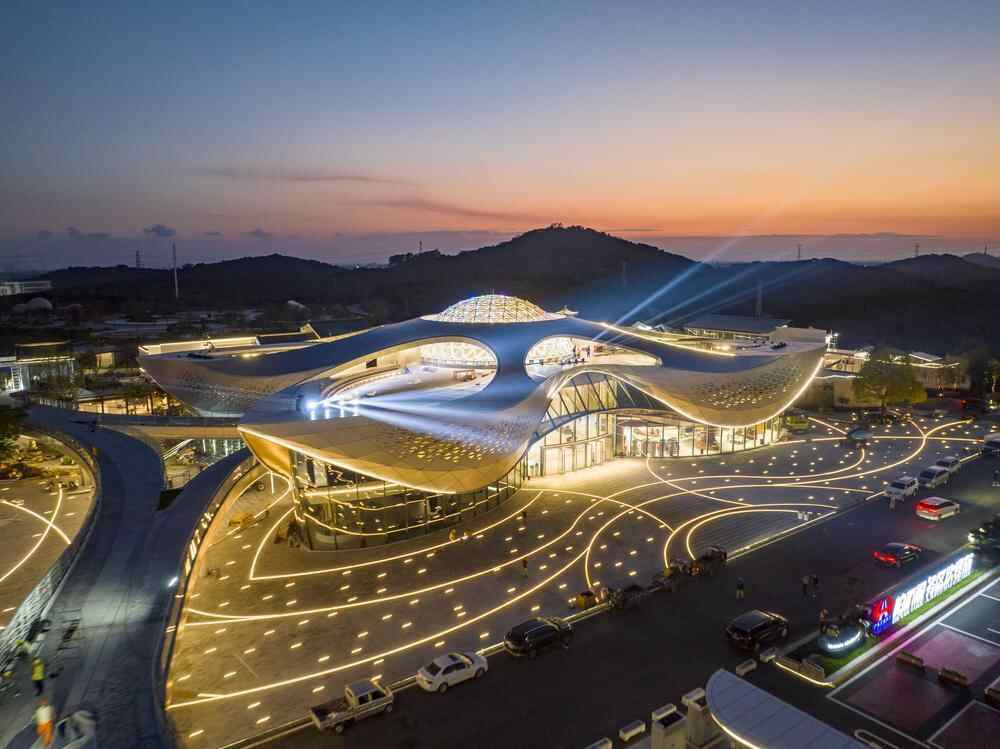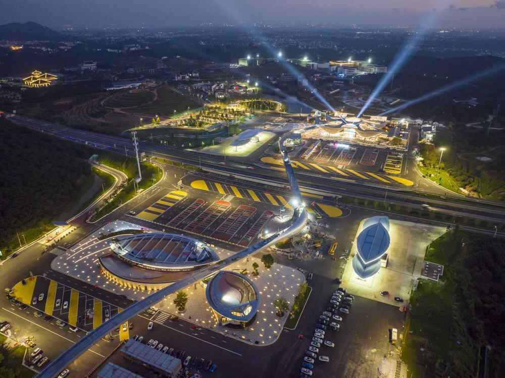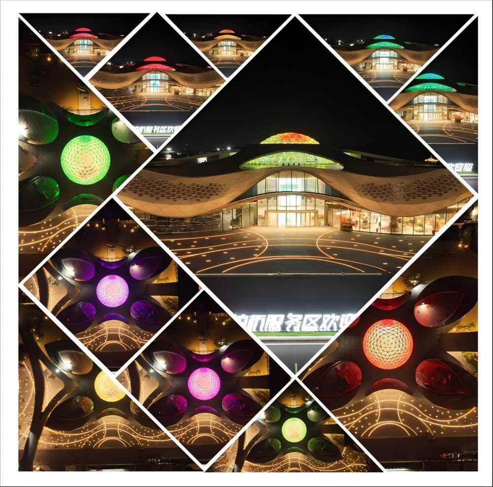 除“荔枝穹顶”外,70组智能激光联动水幕舞台,让停车场区域变身光影剧场。地面设置的线性LED如液态金属般蜿蜒游走,让人行广场变身为光的智慧迷宫。在灯光的勾画映照下,夜幕中的柏桥服务区仿佛成为亮眼的“琥珀”。