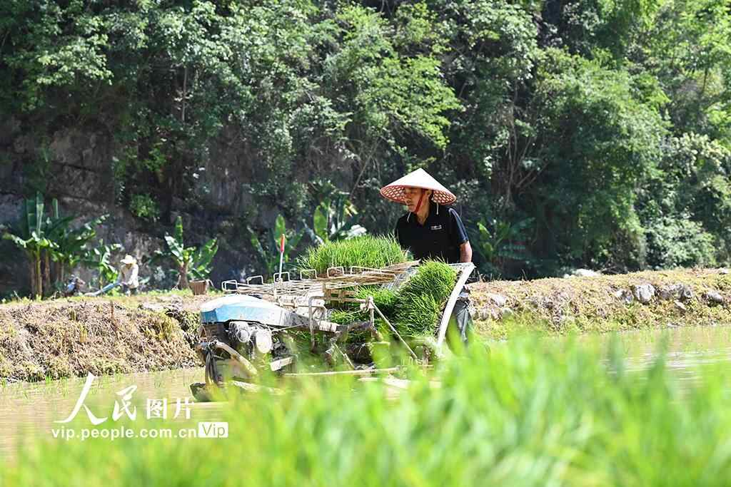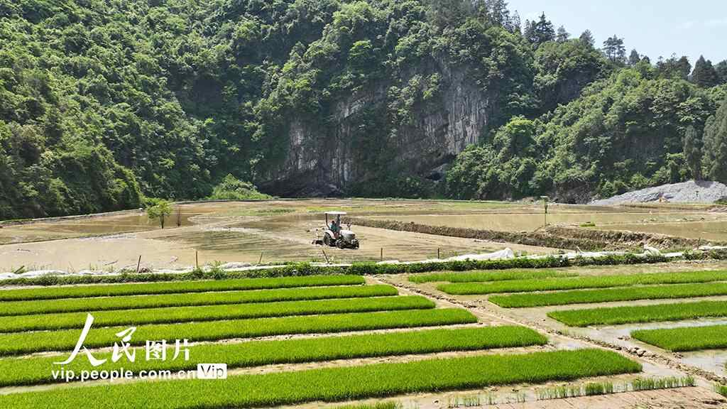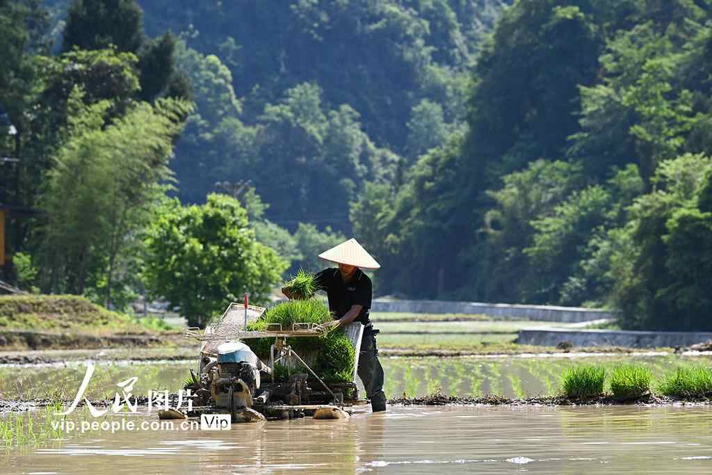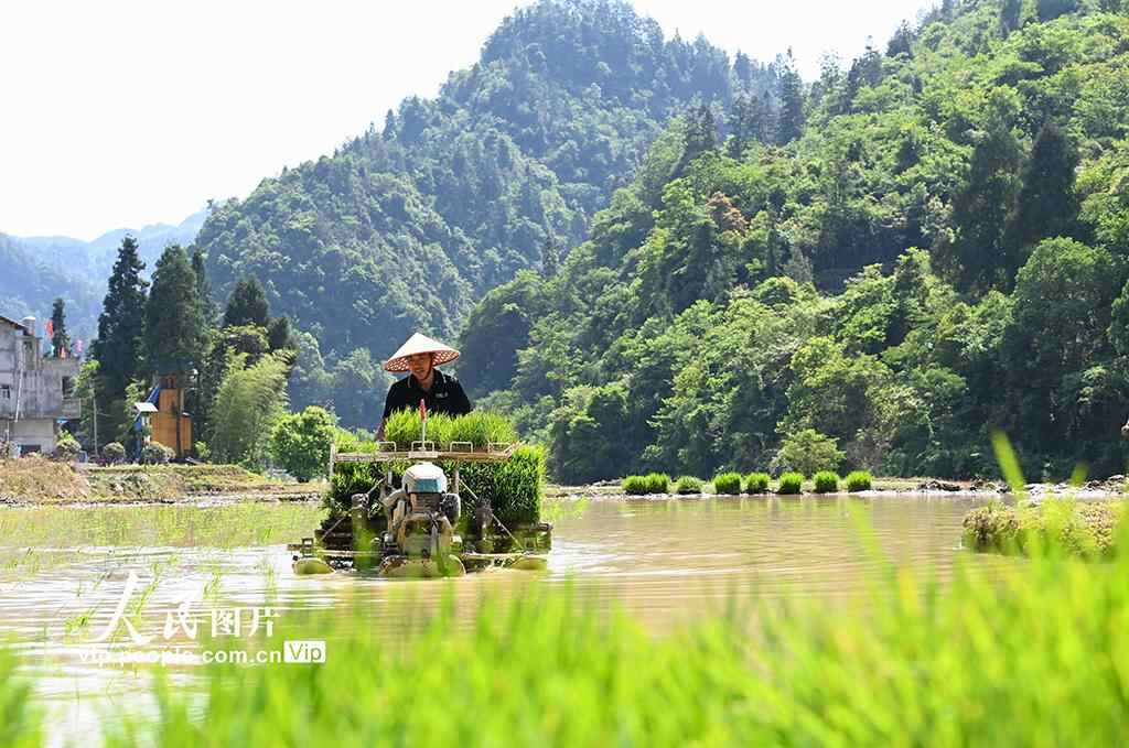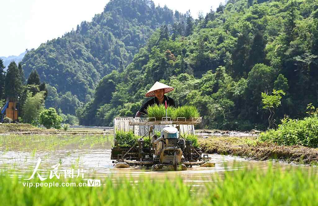 2025年5月13日,在重庆市酉阳土家族苗族自治县黑水镇苏家村高标准水稻田里,农机手驾驶插秧机进行水稻插秧作业。邱洪斌摄(人民图片网)