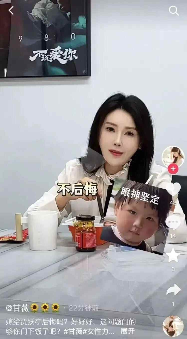 甘薇发文表示:“与贾总共同走过十余年,感恩相遇,亦尊重彼此选择。未来将以母亲、制片人、公益践行者的身份继续前行。三个孩子是我生命的光,新作品《桃枝气泡》也正在启动中,愿用故事传递更多力量。”