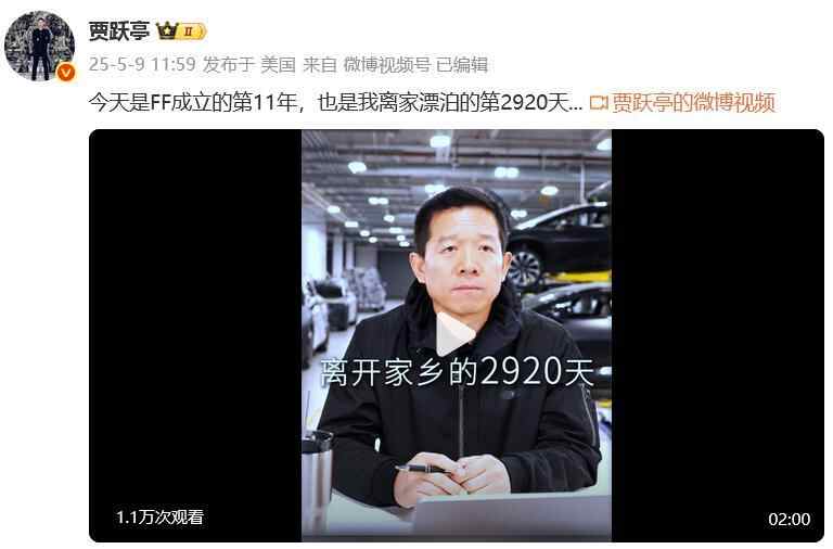 据九派新闻报道,2025年5月9日,FF创始人、乐视创始人贾跃亭发视频纪念FF成立第11周年,主动提及想家想回北京,表示“还债回国”的时间不会太远。