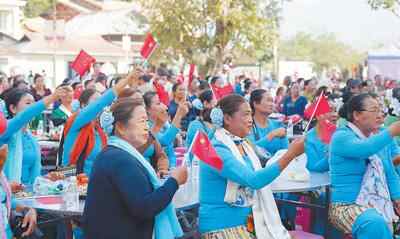 云南德宏瑞丽市姐相镇民众手举国旗观看“中缅民心相通大舞台”迎新春活动表演。