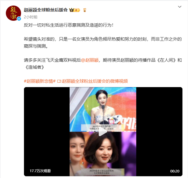 赵丽颖官方后援会微博发文表示反对一切对赵丽颖私生活进行恶意揣测及造谣的行为,呼吁大家期待她作为演员的待播作品。