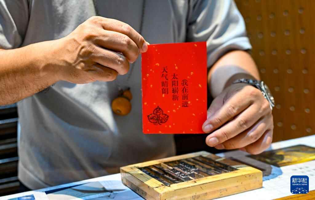 永庆坊一家活字印刷店店主赖朝阳展示自己的活字印刷作品(5月13日摄)。
