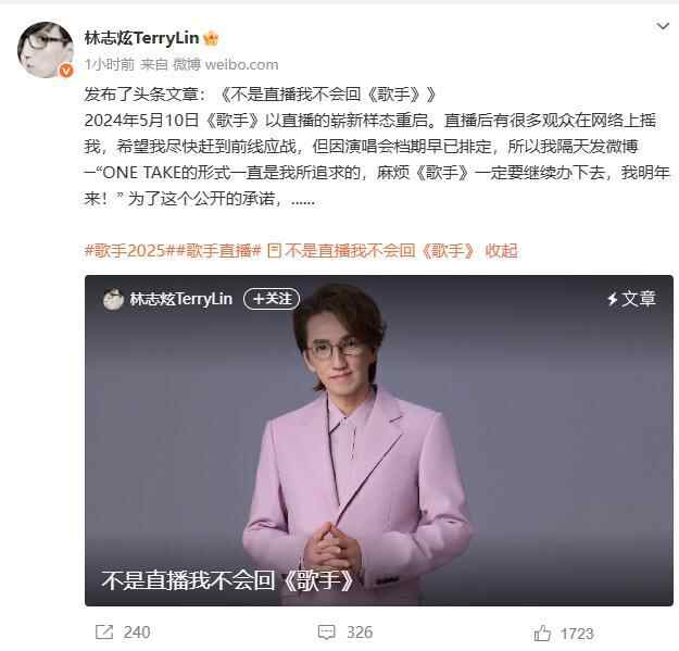 直播后有很多观众在网络上摇我,希望我尽快赶到前线应战,但因演唱会档期早已排定,所以我隔天发微博─“ONE TAKE的形式一直是我所追求的,麻烦《歌手》一定要继续办下去,我明年来!”