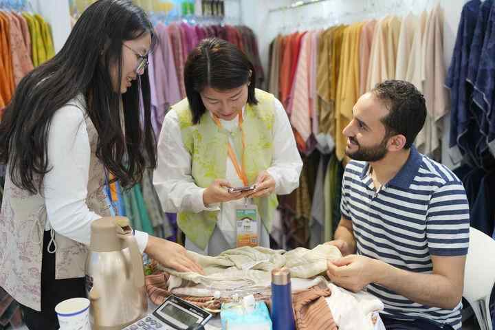 一名来自埃及的客商在2024中国绍兴柯桥国际纺织品面辅料博览会(春季)上选购面料(2024年5月6日摄)。新华社记者 翁忻旸 摄