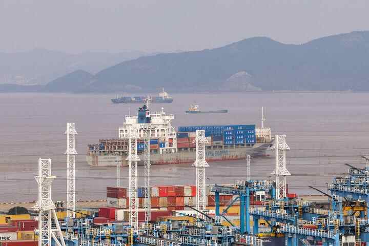 执行“中欧快航”航线首航的“嘉华宁波”轮启航驶离宁波舟山港穿山港区(2024年12月30日摄)。新华社记者 江汉 摄
