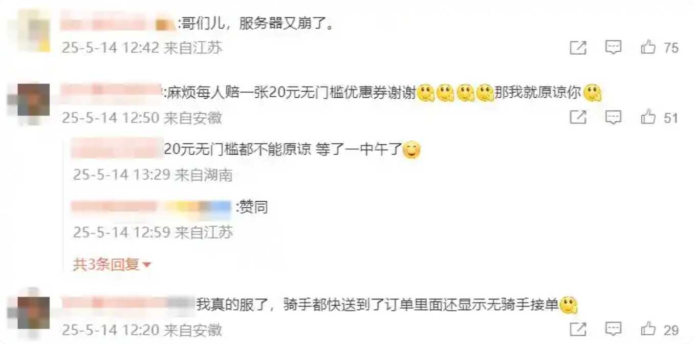 感谢大家的理解与支持,为表达歉意,所有超时20分钟以上的外卖订单,京东全部免单。同时,对于今日午高峰宕机期间所有下单用户,京东外卖将于今天额外发放一张10元无门槛优惠券到下单账户。