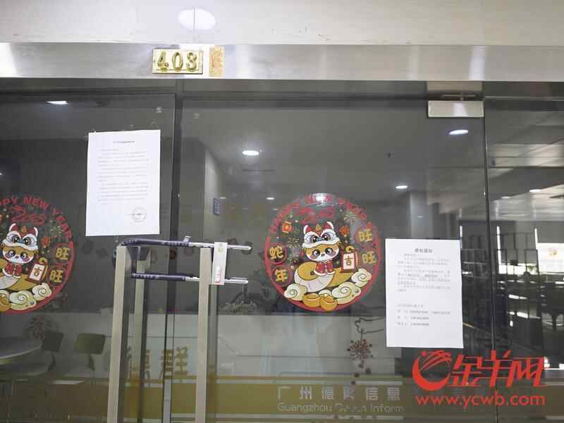 根据报料人提供的信息,记者来到了白云区永平街同泰路的一栋商务楼。被投诉对象广州德群信息咨询有限公司(以下简称广州德群)就在这栋楼里。走出四楼电梯即可看到该公司大门已上锁,内部空无一人。透过玻璃门,只有象征“风水财位”的工艺品仍在转动。