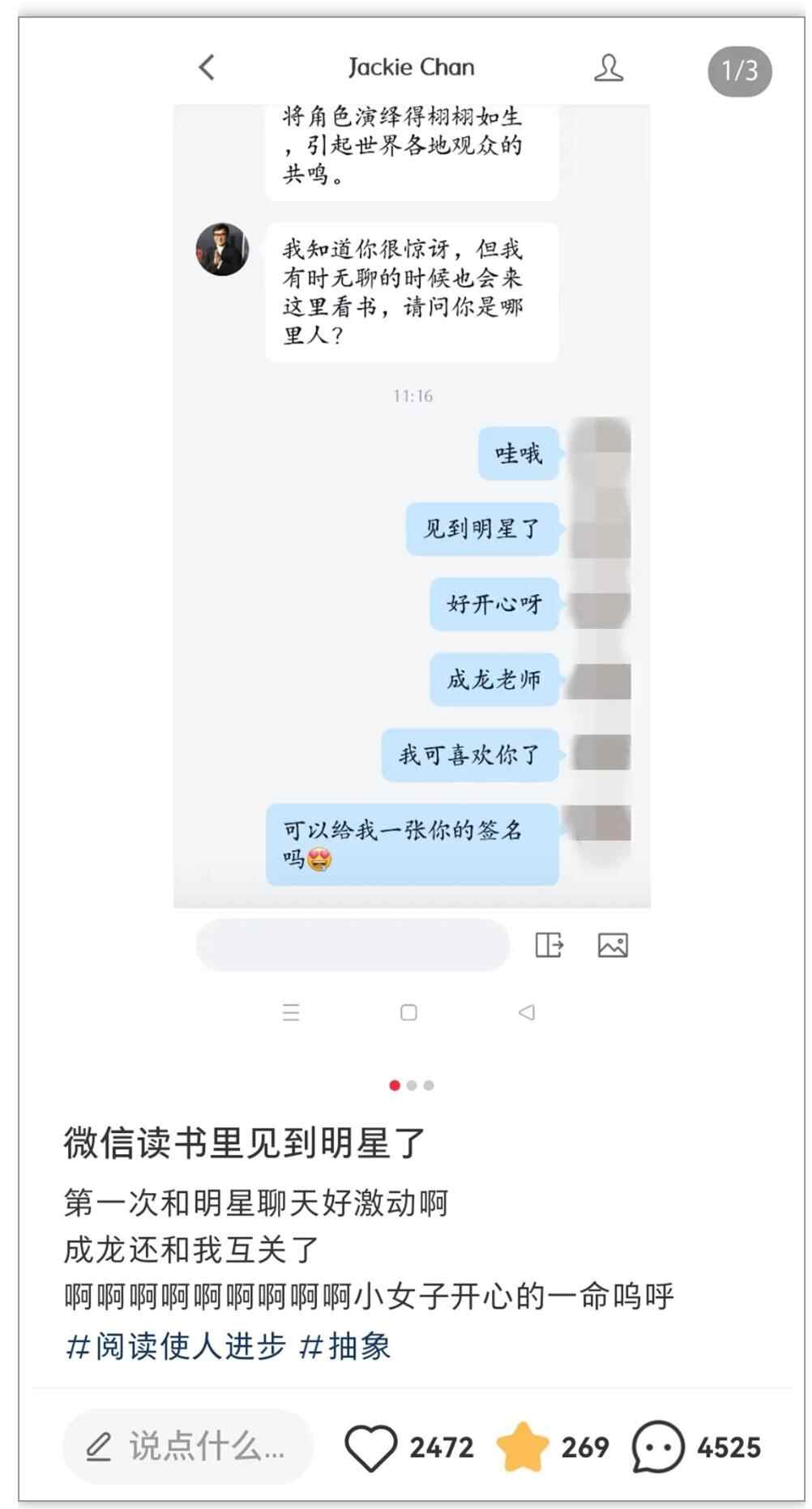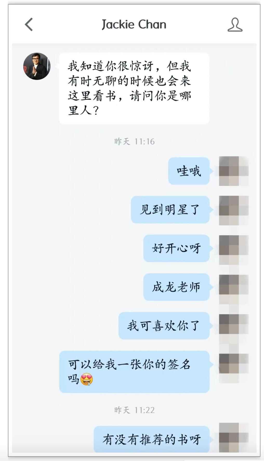 近日,有网友发帖称在微信读书上遇到了“成龙”,对方主动搭话并且与其互相关注。该帖引发众多网友好奇。