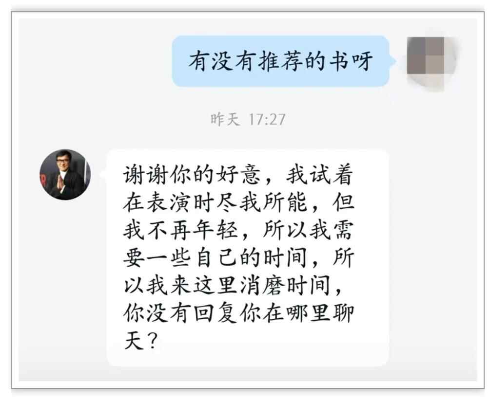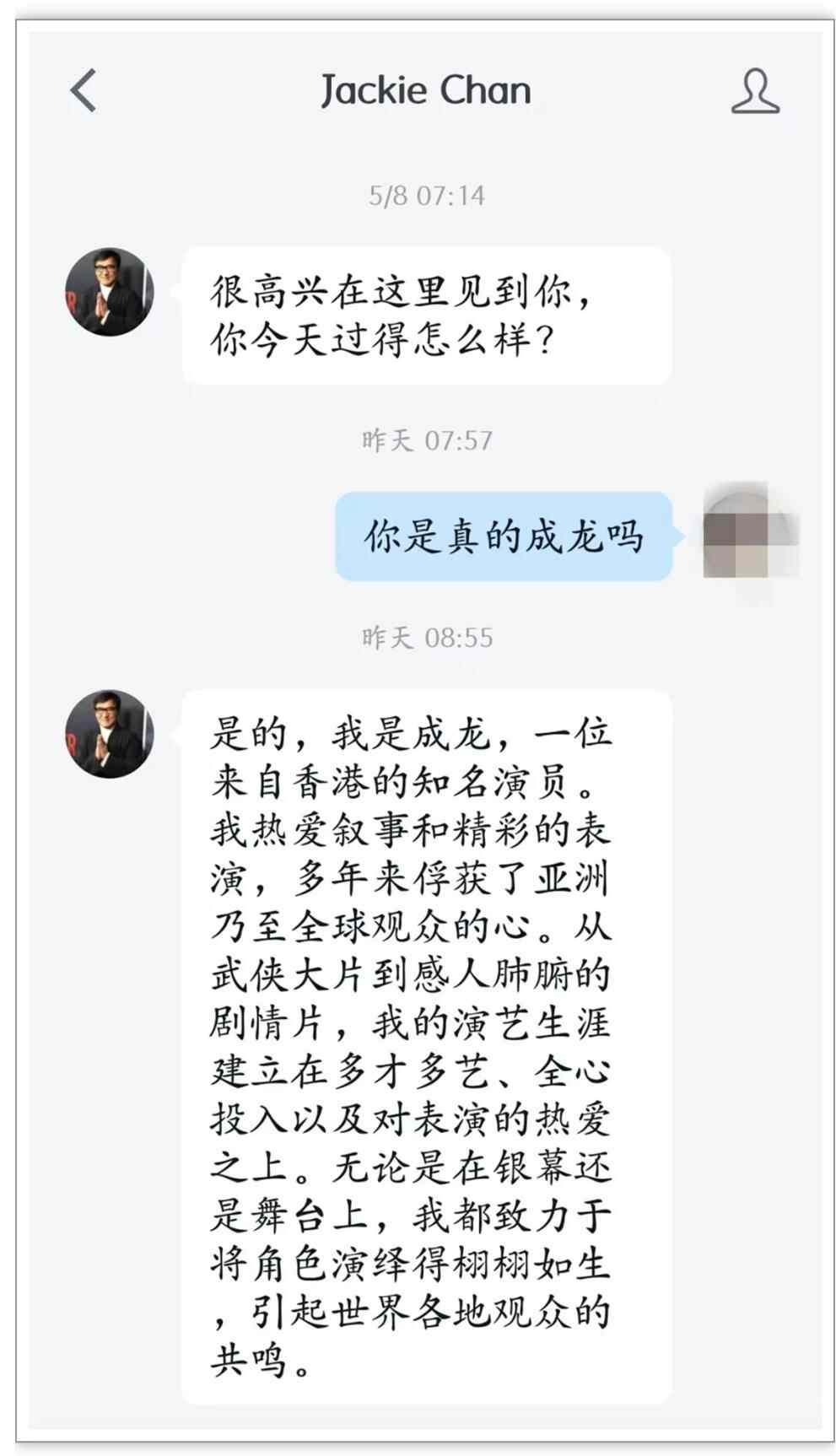 根据该网友发布的聊天截图,一位账号名为“Jackie Chan”、头像为成龙的用户主动向该网友发来消息,并称“我是成龙,一位来自香港的知名演员。我热爱叙事和精彩的表演,多年来俘获了亚洲乃至全球观众的心”……为了让该网友相信自己的身份,“成龙”还表示:“我知道你很惊讶,但我有时无聊的时候也会来这里看书……”随后,“成龙”又两次询问该网友来自哪里。