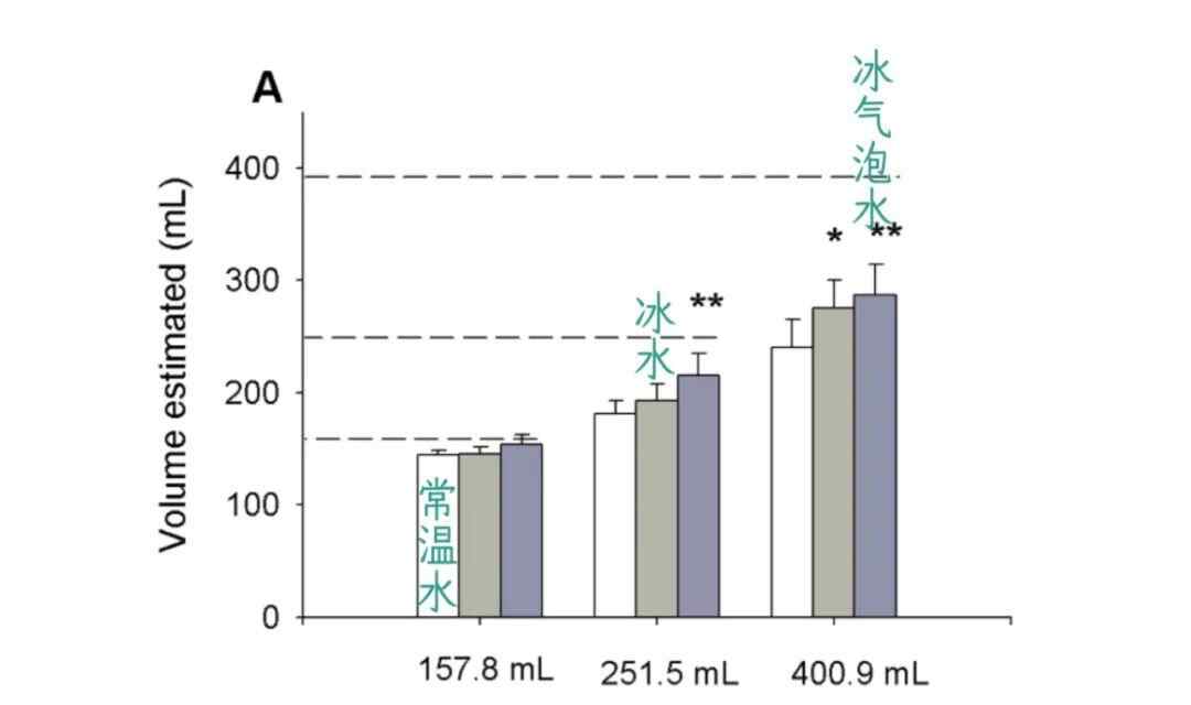 研究人员让受试者们使用吸管杯喝饮料,并且不能用手拿水杯,然后让受试者预估自己喝了多少饮料。结果显示,喝冰气泡水的人预估的比常温水多 22%。