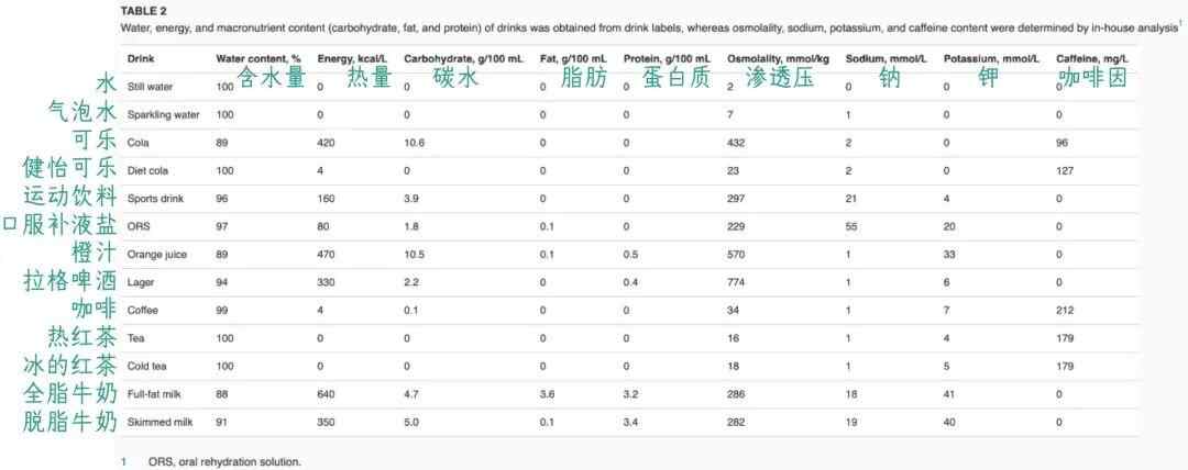 研究人员招募了 86 名受试者,测试了 13 种常见饮料(包括水、气泡水、可乐、健怡可乐、运动饮料、口服补液盐、橙汁、拉格啤酒、热红茶、冰镇红茶、咖啡、全脂牛奶和脱脂牛奶)对人体的补水效果。