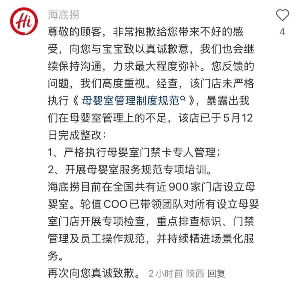 记者在评论区找到了海底捞的回复:尊敬的顾客,非常抱歉给您带来不好的感受,向您与宝宝致以真诚歉意,我们也会继续保持沟通,力求最大程度弥补。您反馈的问题,我们高度重视。经查,该门店未严格执行《 母婴室管理制度规范 》,暴露出我们在母婴室管理上的不足,该店已于5月12日完成整改: