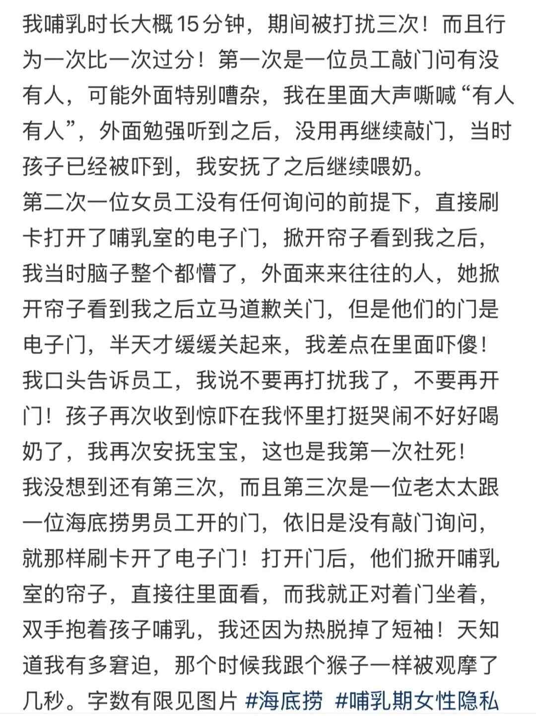 5月12日,有IP属地为天津的网友发帖称,她在5月11日母亲节当天带着宝宝去海底捞用餐,去母婴室给孩子喂奶期间被员工打扰3次,后两次甚至被员工打开门。