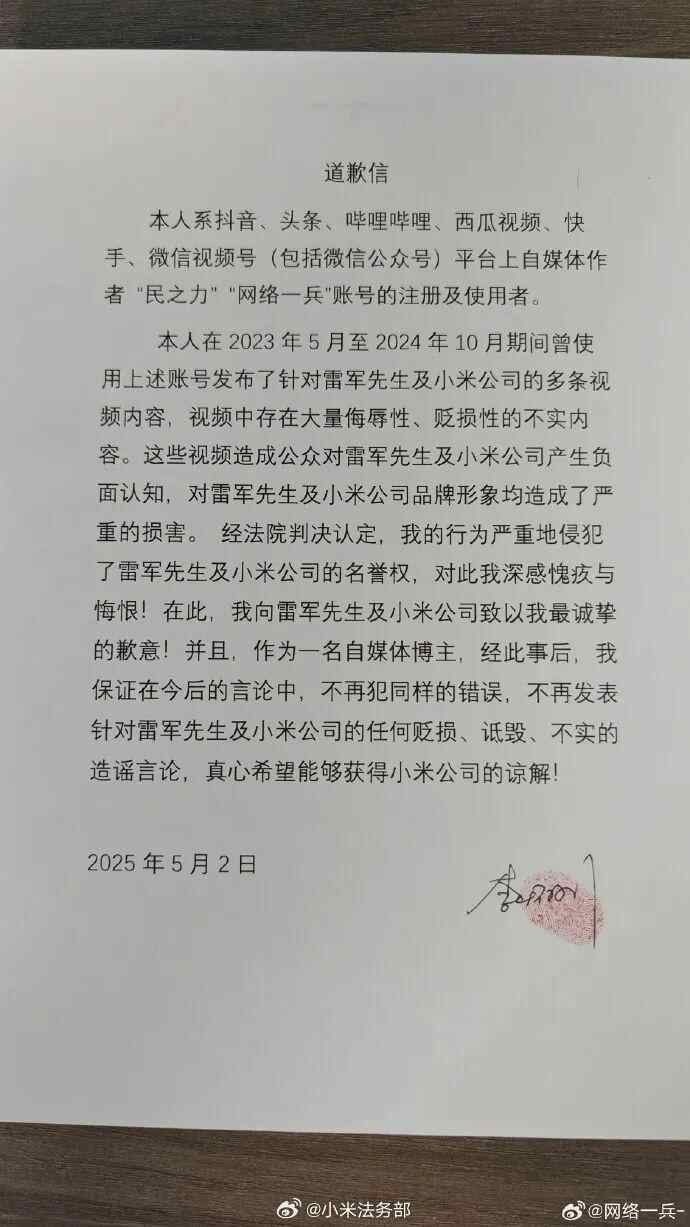 小米法务部还附上了该博主签名的道歉信:“这些视频造成公众对雷军先生及小米公司产生负面认知,对雷军先生及小米公司品牌形象均造成了严重的损害。经法院判决认定,我的行为严重地侵犯了雷军先生及小米公司的名誉权,对此我深感愧疚与悔恨!在此,我向雷军先生及小米公司致以我最诚挚的歉意!”