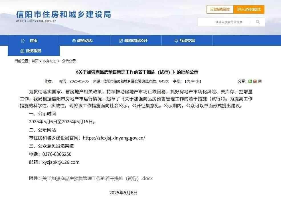 5月6日,信阳市住房和城乡建设局在其官方发布信息称,为贯彻落实国家、省房地产相关政策,持续推动房地产市场止跌回稳,抓好房地产市场化风险、去库存、控增量工作,该局根据信阳市房地产市场运行情况,起草《关于加强商品房预售管理工作的若干措施(试行)》(以下简称《措施》)并面向社会公示,公开征集意见。