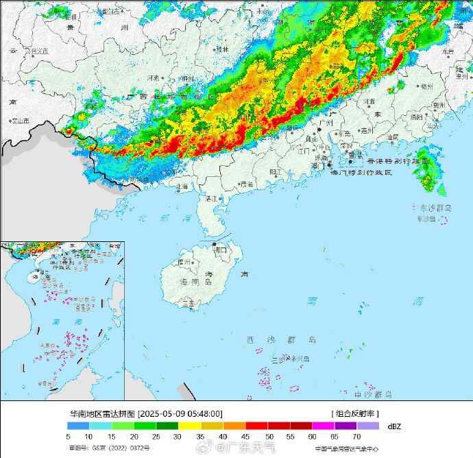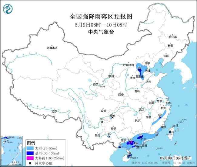 中央气象台5月9日06时发布暴雨蓝色预警:预计,5月9日08时至10日08时,广西东部和南部、广东大部、福建西北部和东南部、海南岛东北部、浙江东南部、华北东部等地部分地区有大到暴雨,其中,广西东部、广东西部等地局地有大暴雨(100~150毫米)。上述部分地区伴有短时强降水(最大小时降雨量30~50毫米,局地可超过80毫米),局地有雷暴大风或冰雹等强对流天气。