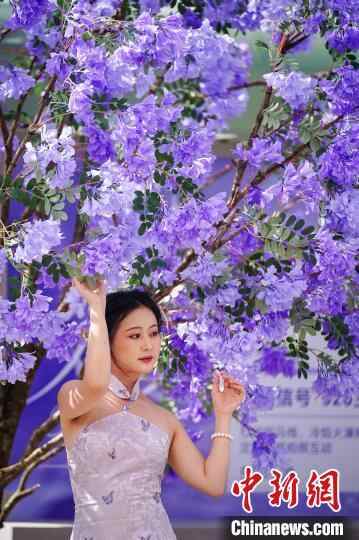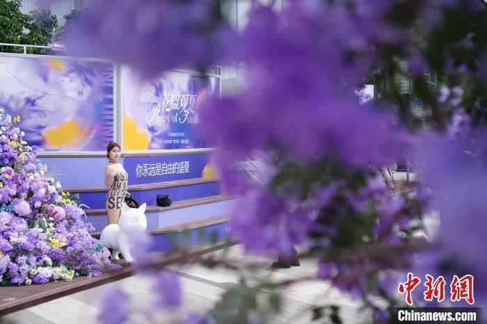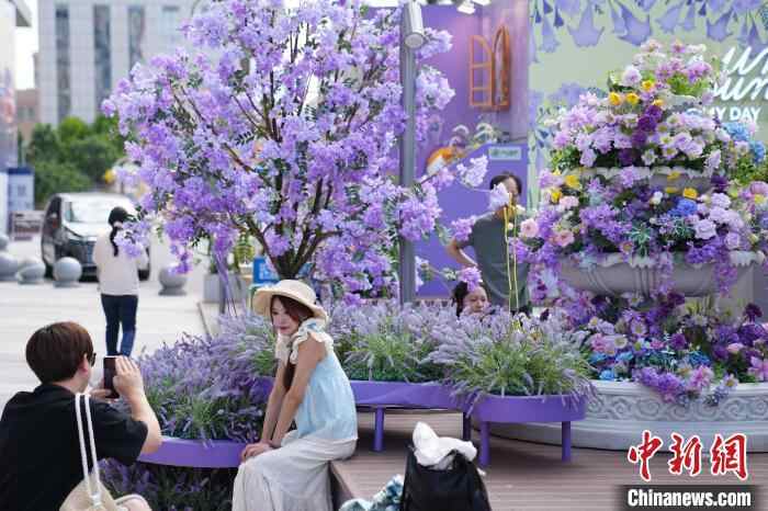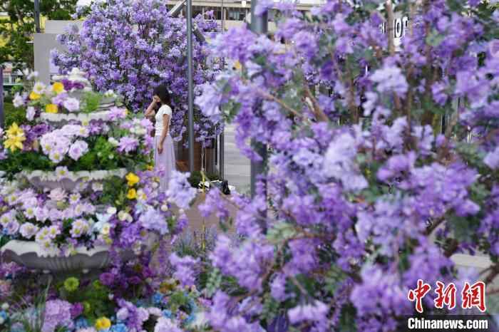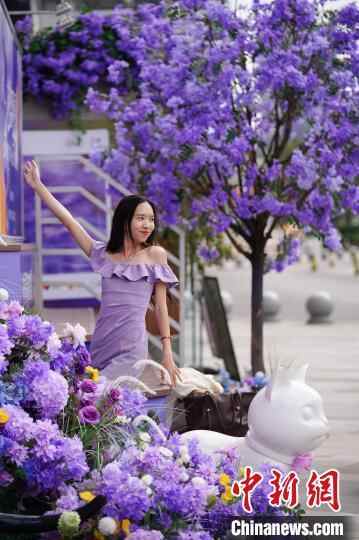 5月8日,紫色花海吸引市民。近日,昆明一商场打造的蓝花楹花艺“街区”亮相,浪漫的紫色花海吸引众多民众打卡拍照。中新社记者 刘冉阳 摄