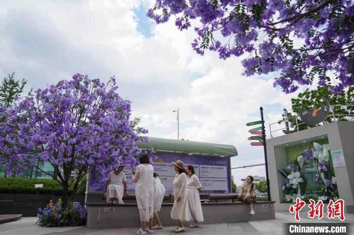 5月8日,市民在蓝花楹树下拍照。近日,昆明一商场打造的蓝花楹花艺“街区”亮相,浪漫的紫色花海吸引众多民众打卡拍照。中新社记者 刘冉阳 摄