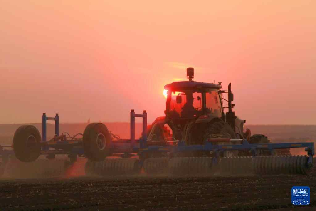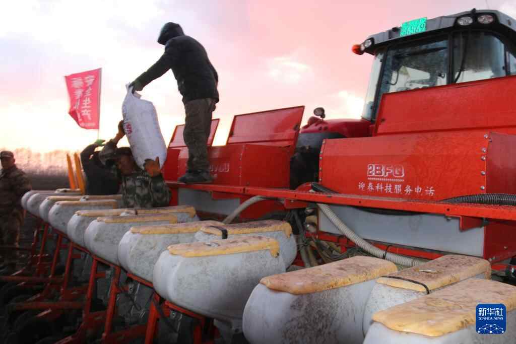 5月7日,在北大荒集团黑龙江五大连池农场有限公司一地块,农机工人在夕阳下为播种机添加大豆种子和肥料。