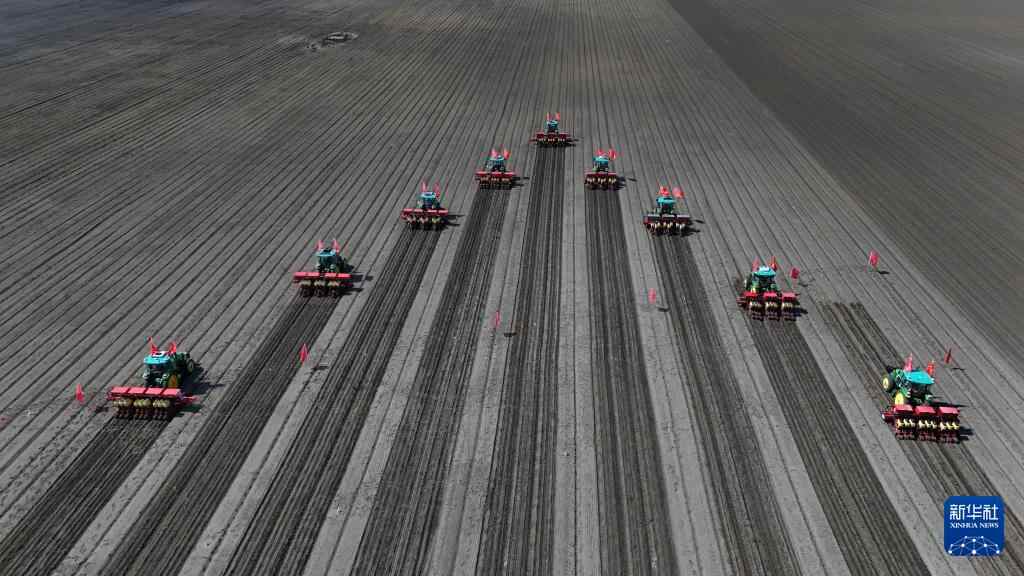 5月8日,在北大荒集团黑龙江红星农场有限公司第四管理区,大马力机车牵引进口播种机进行玉米播种工作(无人机照片)。