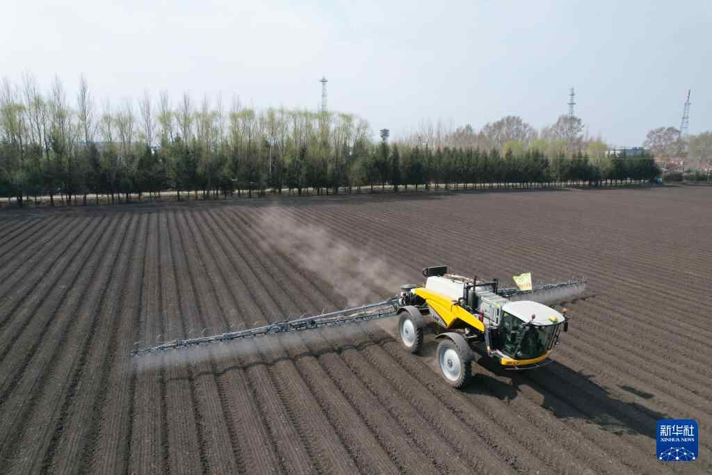 5月8日,在北大荒集团黑龙江建设农场有限公司一地块,大马力机车在开展封闭除草作业(无人机照片)。
