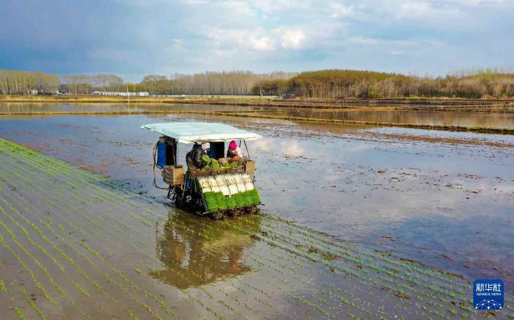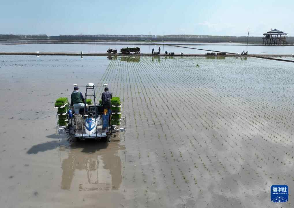 5月8日,在北大荒集团黑龙江绥滨农场有限公司广信管理区,种植户驾驶装有北斗卫星导航辅助直行系统的高速插秧机进行水稻插秧作业。