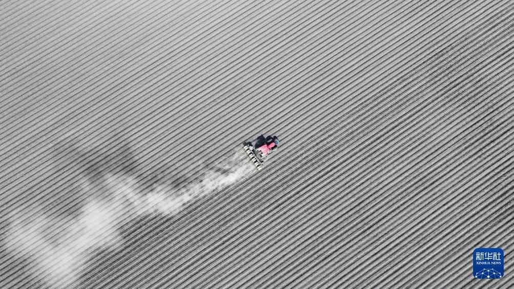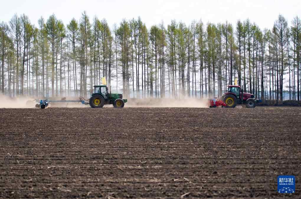 5月8日,在北大荒集团北安分公司长水河农场有限公司第二管理区的大豆播种地块,一台气吸式精密播种机在进行高标准大豆播种作业,镇压机紧随其后,防止土壤水分流失。