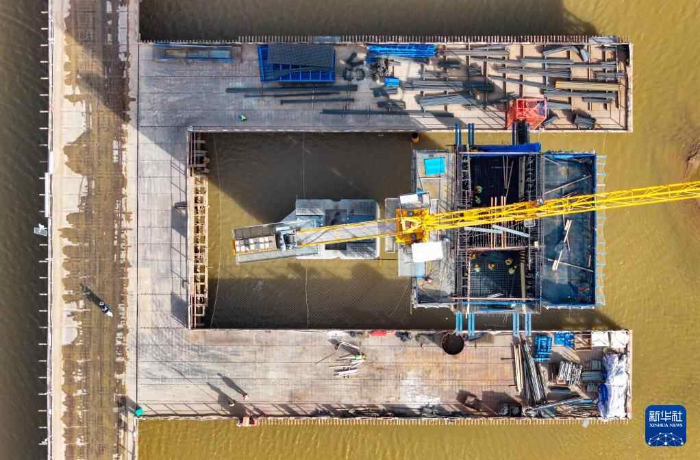 5月8日拍摄的国道110线磴口黄河大桥上部箱梁悬浇施工现场(无人机照片)。