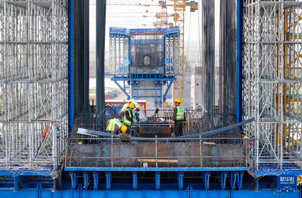 5月8日,建设者在国道110线磴口黄河大桥上部箱梁悬浇施工现场作业(无人机照片)。