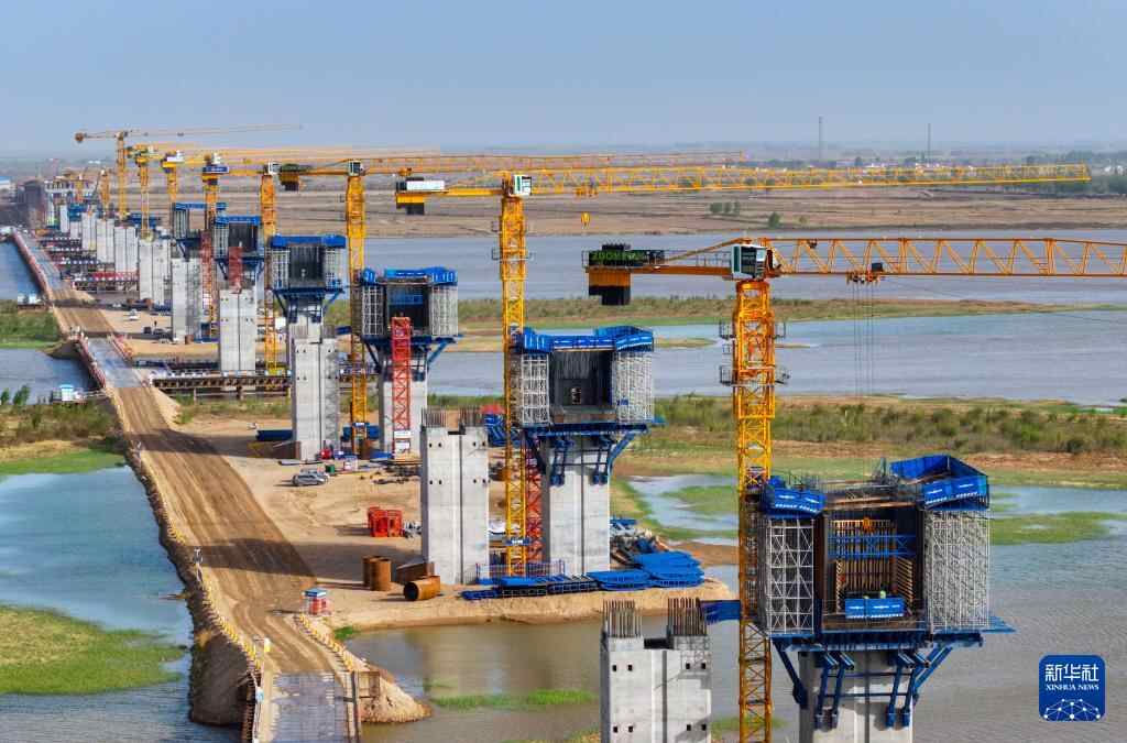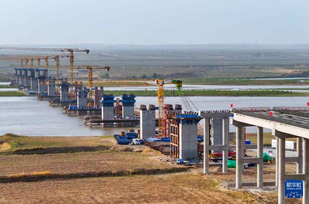 5月8日拍摄的国道110线磴口黄河大桥施工现场(无人机照片)。