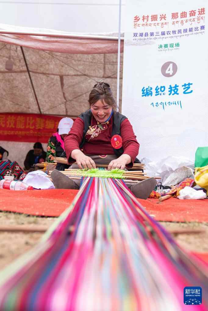 2024年6月20日,那曲市双湖县农牧民边曲参加手工编织技艺比赛。