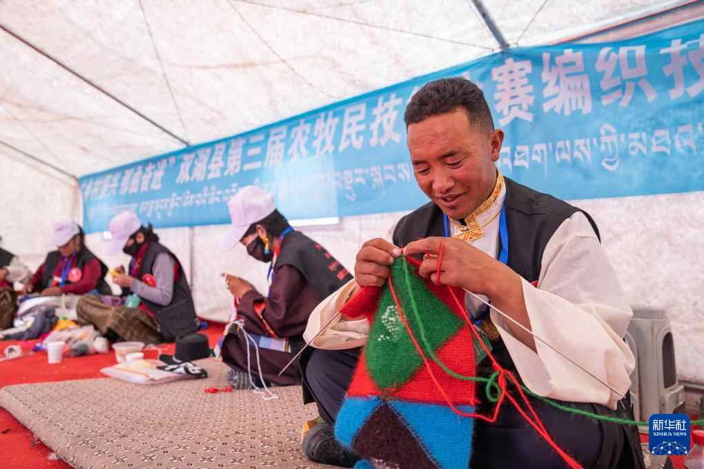 2024年6月20日,那曲市双湖县农牧民加措参加手工编织技艺比赛。