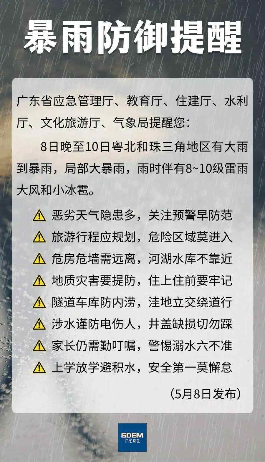 针对强对流天气,5月8日,广东六部门联发暴雨预警。广东省应急管理厅、教育厅、住建厅、水利厅、文化旅游厅、气象局提醒:8日晚至10日粵北和珠三角地区有大雨到暴雨,局部大暴雨,雨时伴有8~10级雷雨大风和小冰雹。