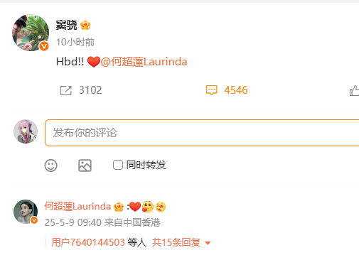 不过,在5月9日何超莲生日当天,窦骁在0时卡点发文祝何超莲生日快乐(“Hbd”为“Happy birthday”缩写)。当天早上何超莲在评论区回应互动,两人疑在辟谣婚变传闻。