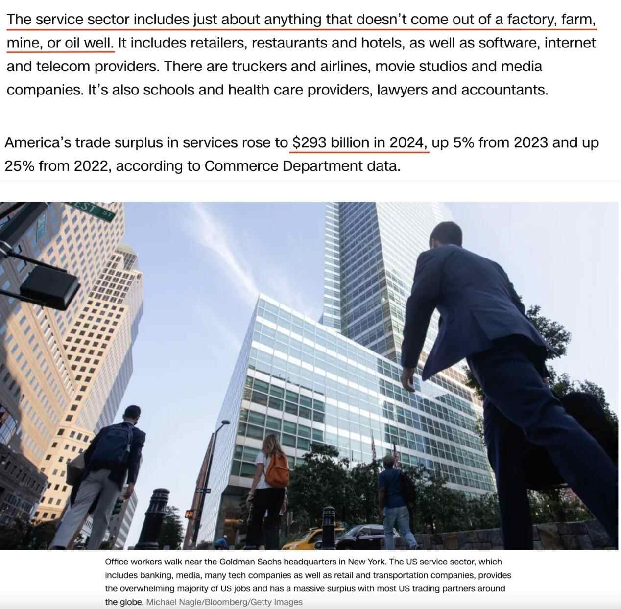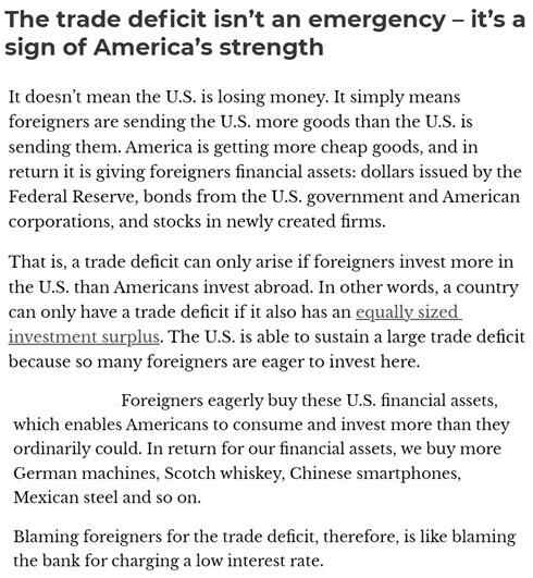文章批评美国政府的关税政策不讲道理:“美国用美元和金融资产换来了德国的机械、英国的威士忌、墨西哥的钢材……现在却将贸易逆差归咎于贸易伙伴,这就好比责怪银行为我们提供低息贷款。”