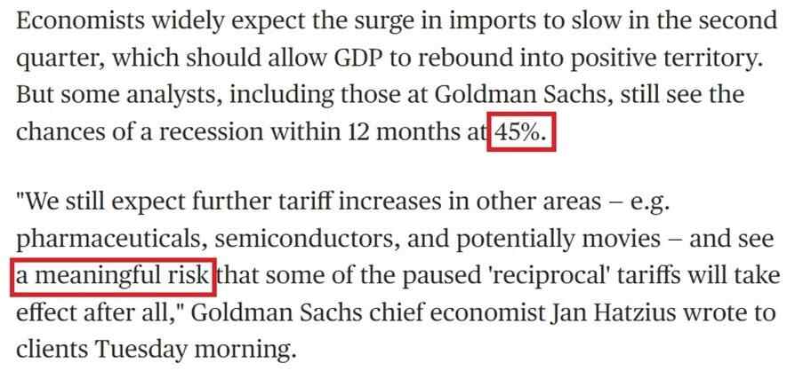 高盛集团首席经济学家哈祖斯日前致信提醒该公司客户:“我们预计其他领域的关税会进一步提高,比如药品、半导体,可能还有电影。而且我们认为,一些暂停的‘对等’关税最终会生效,这是一个很大的风险。”