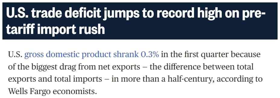 据美国富国银行经济学家观察,贸易逆差对美国一季度经济的拖累是半个多世纪以来最大的一次。