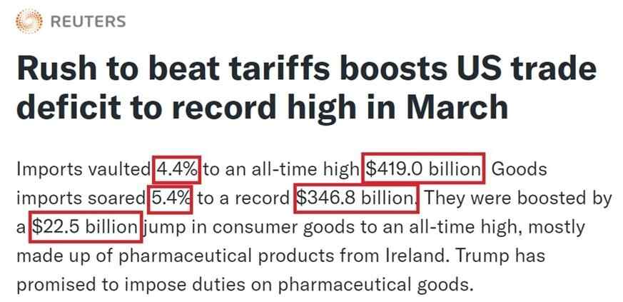 3月贸易逆差爆表,是因为美国企业在美政府全面征收“对等关税”之前抓紧增加了商品进口。