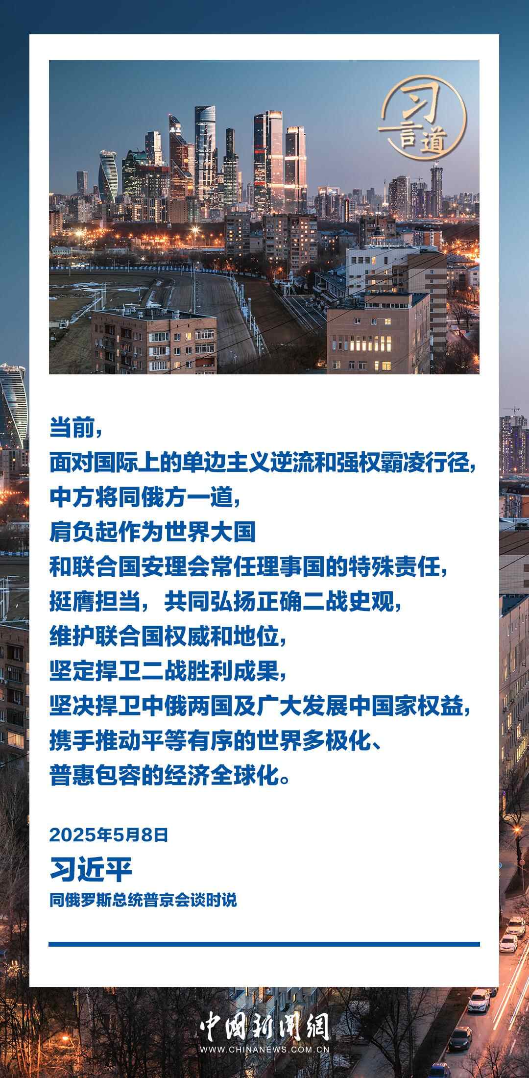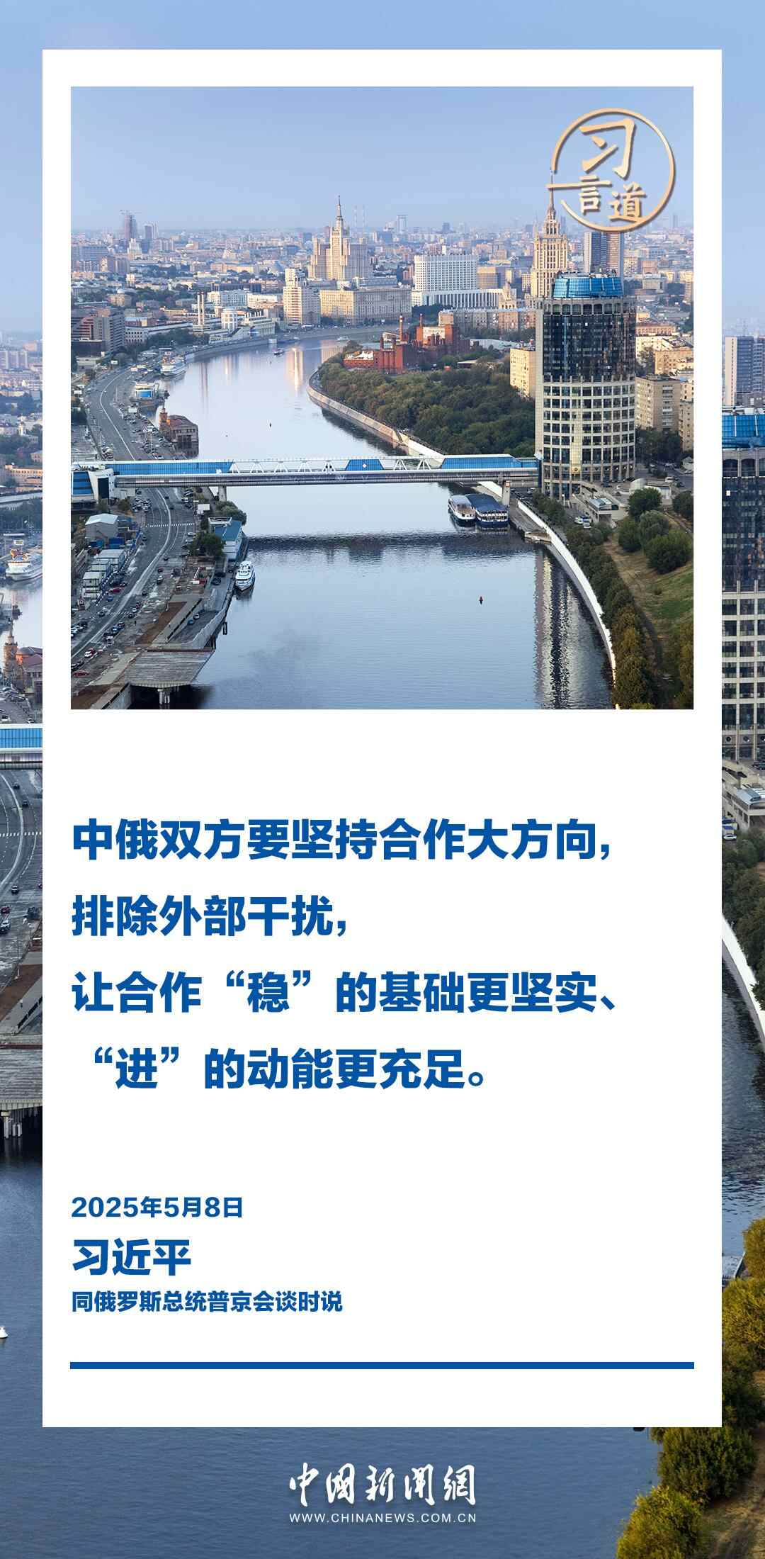 当地时间5月8日,俄罗斯总统普京同中国国家主席习近平在莫斯科克里姆林宫举行会谈。习近平指出——