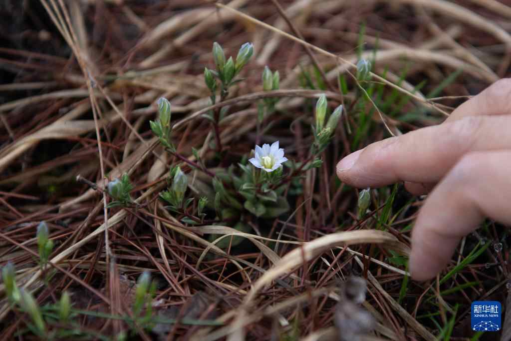 2025年4月22日,黄山风景区管理委员会园林局资源保护管理科林业工程师汤明霞在封闭轮休中的莲花峰景点观察固定样方草本植物黄山龙胆的生长状况。