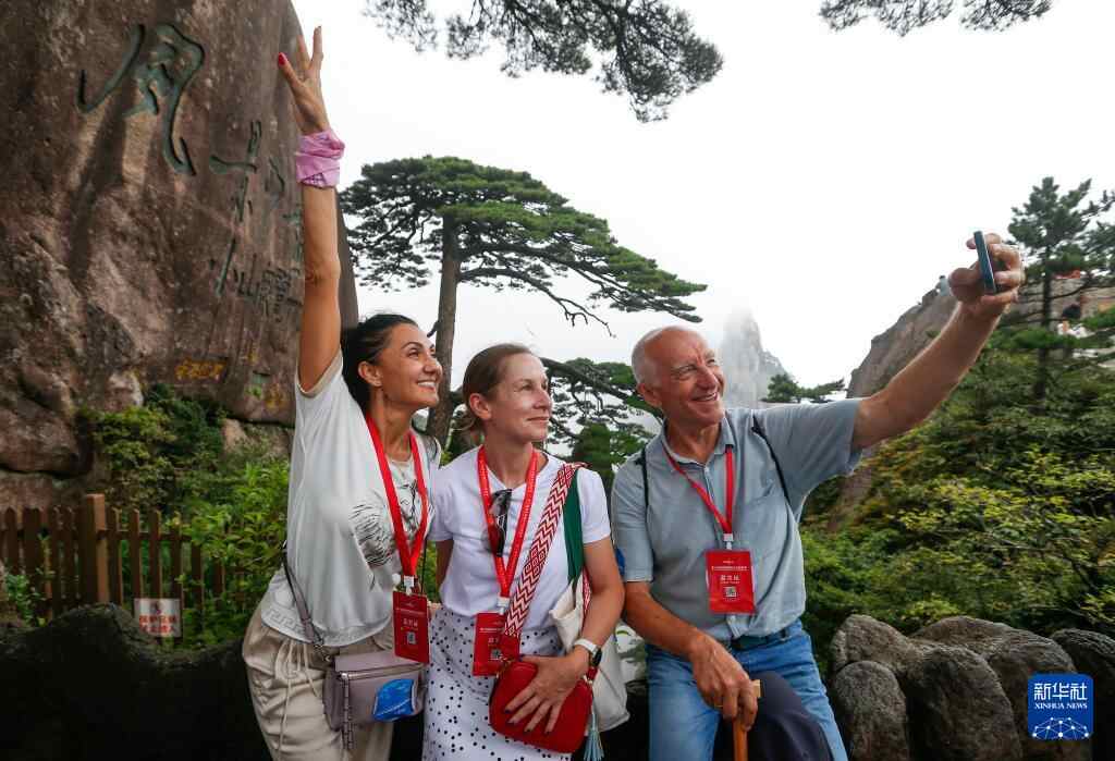 2024年9月12日,境外游客在黄山风景区的迎客松前自拍留念。